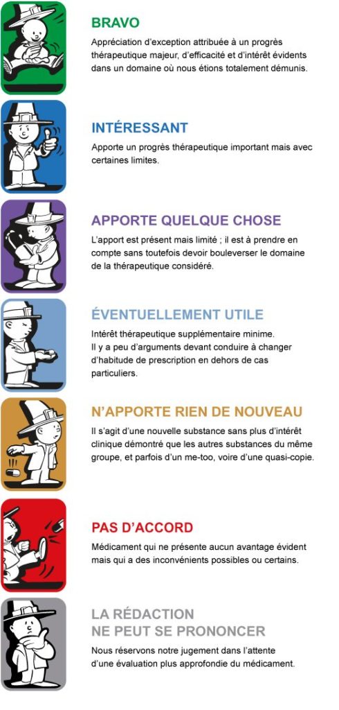 En effet, Prescrire illustre ses avis d’un “bonhomme” plus ou moins content comme le Ulysse de Télérama (Pénélope depuis quelques mois).