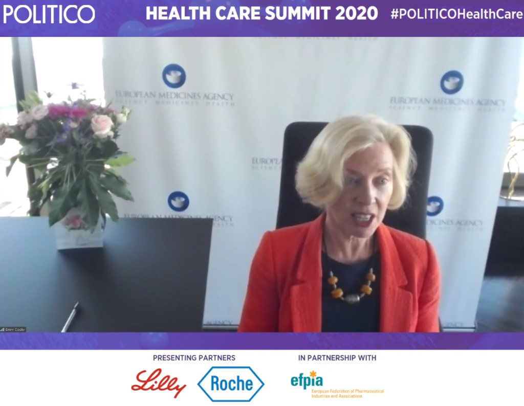 Commentons juste cette photo qui est une capture d’écran d’une interview de sa nouvelle présidente, Emer Cooke, le jour de son investiture en 2020. A Bruxelles, personne ne semble gêné de voir apparaître en sponsor les laboratoires Lilly, Roche, ainsi que le lobby européen des industriels du médicament Efpia. Cela joue probablement, Emer Cooke a travaillé pour ce lobby pendant 7 ans.